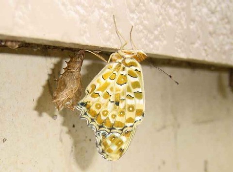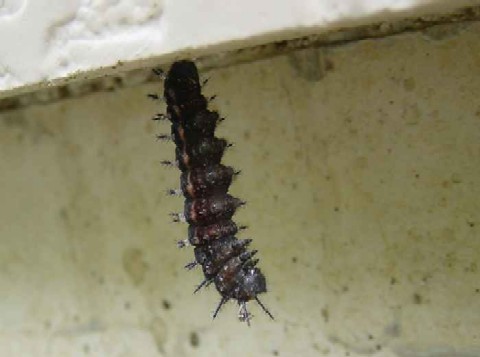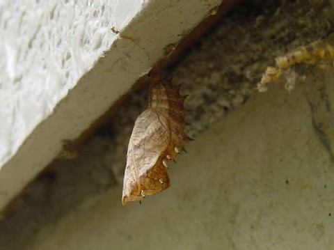 7月25日、サナギにあるのはどんな風になるのかナー その様子を見たかったのですが 3時間くらい後にもうサナギになっていました 生まれたては柔らかく赤く、「赤ちゃん」という感じでした じきに体の色が茶色っぽくしっかりしてきました |