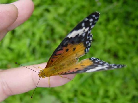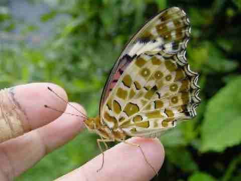 8月2日12時すぎ 写真を撮るため羽根を開かせようと風を送ったら飛び立ってしまった 近くの木にとまったところで前から指を入れたら、とまってくれた |