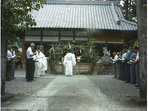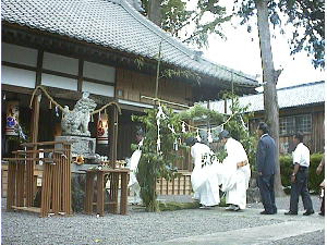 6月の大祓「ちがや」で、人が通れるような大きな輪を作り、二本の青竹の間に建てて、その前にお供え物を供え、神主さんが大祓の祝詞をあげます。参加しているのは、3人の地元の神主さん、氏子総代の方々、地元の名士?(地区長、町会議員、学校長、警察駐在、JA出張所長など)。 茅の輪は、お祭りの後も残してあるので、地元の人がお参りに来ます。 |