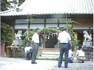 茅の輪くぐり祝詞の後、お供え物を下げてから、神主さんに続き一列になって全員が左、右、左と三回{ちのわ」をくぐります。この後、そのかたわらで古いお札を燃やします。 大祓は、1年を2回に分けて、正月を迎える12月と、7月のお盆を迎える6月に、おはらいをする習わしのようです。 |