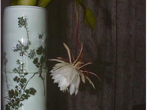 しばらく寝て、午前1時30分、目が覚めたので見たら、まだ花は開いていましたが下にだらんと垂れてしまっていました。