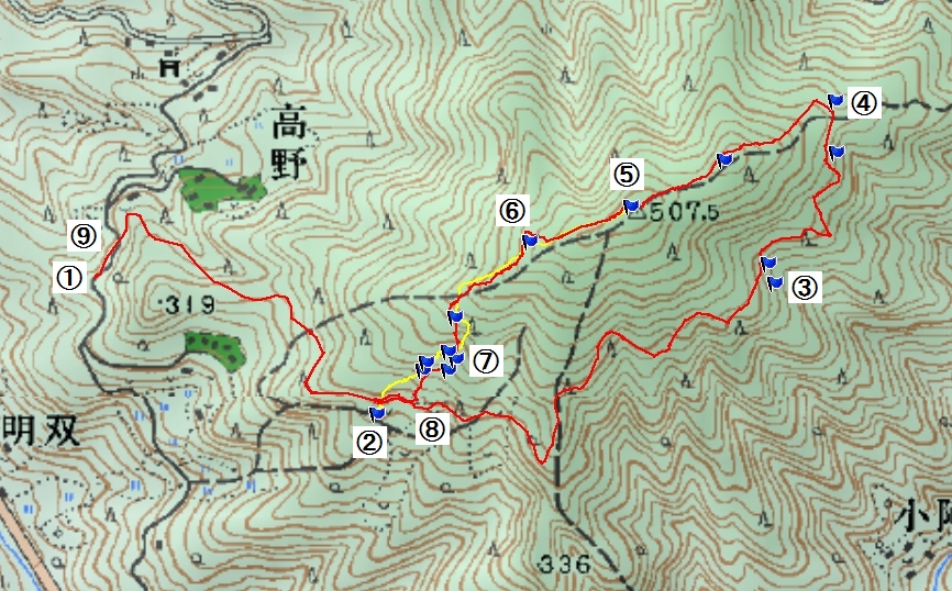 黄色い線は、大村道(宮平から山頂への登山ルートです。。